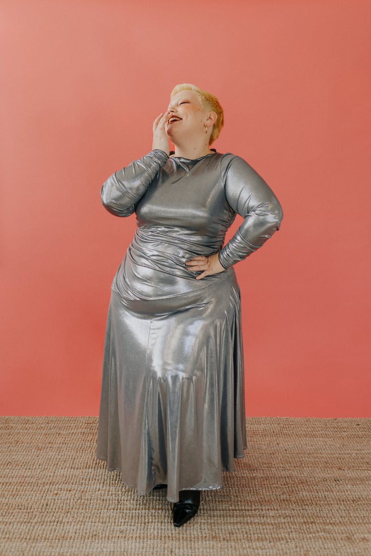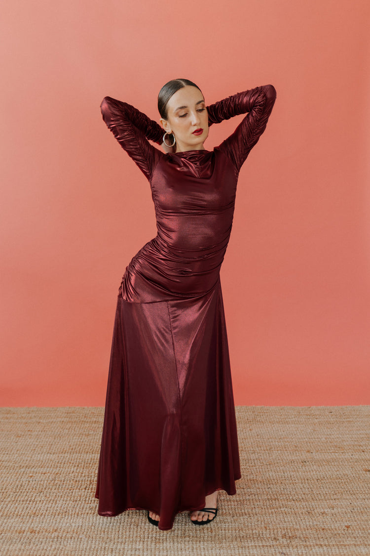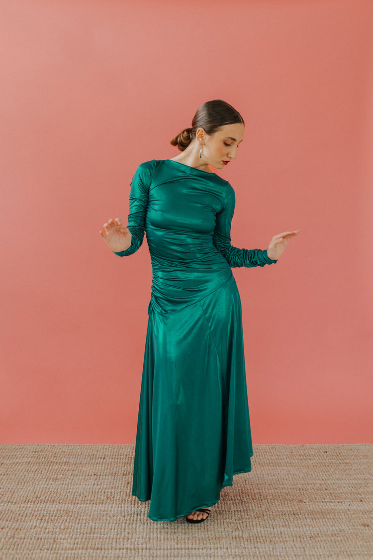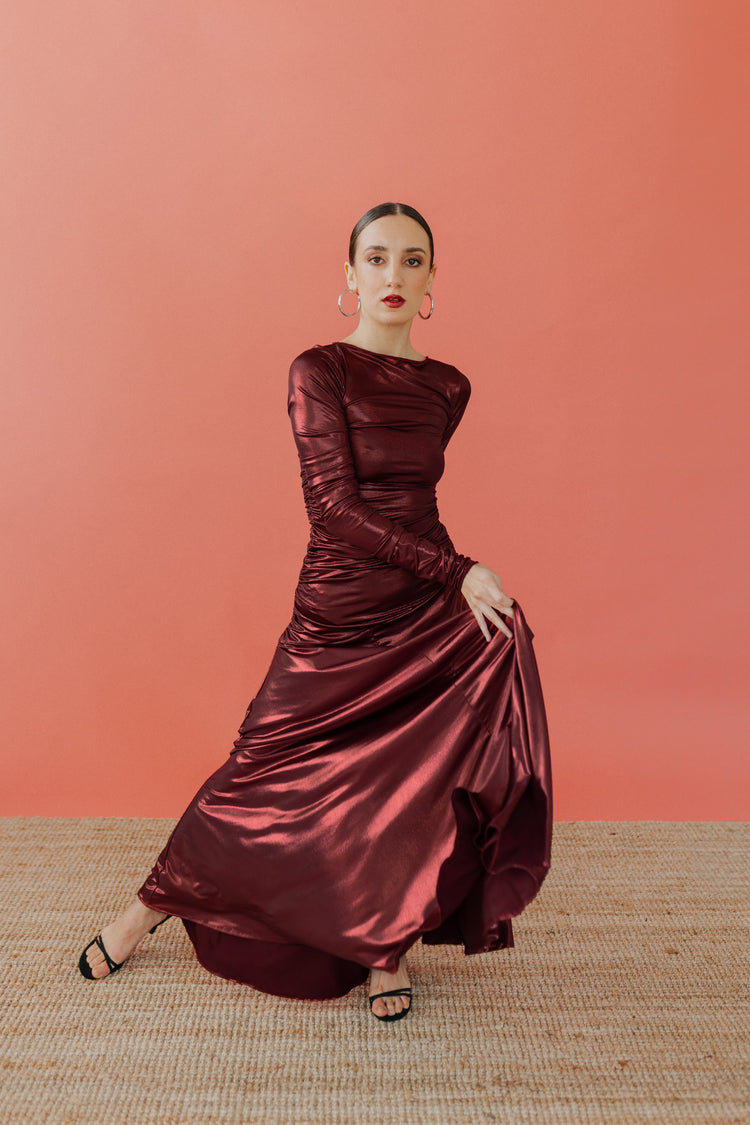 Lo scollo è a barca ed il corpo dell’abito è completamente drappeggiato, la gonna ampia ed asimmetrica.