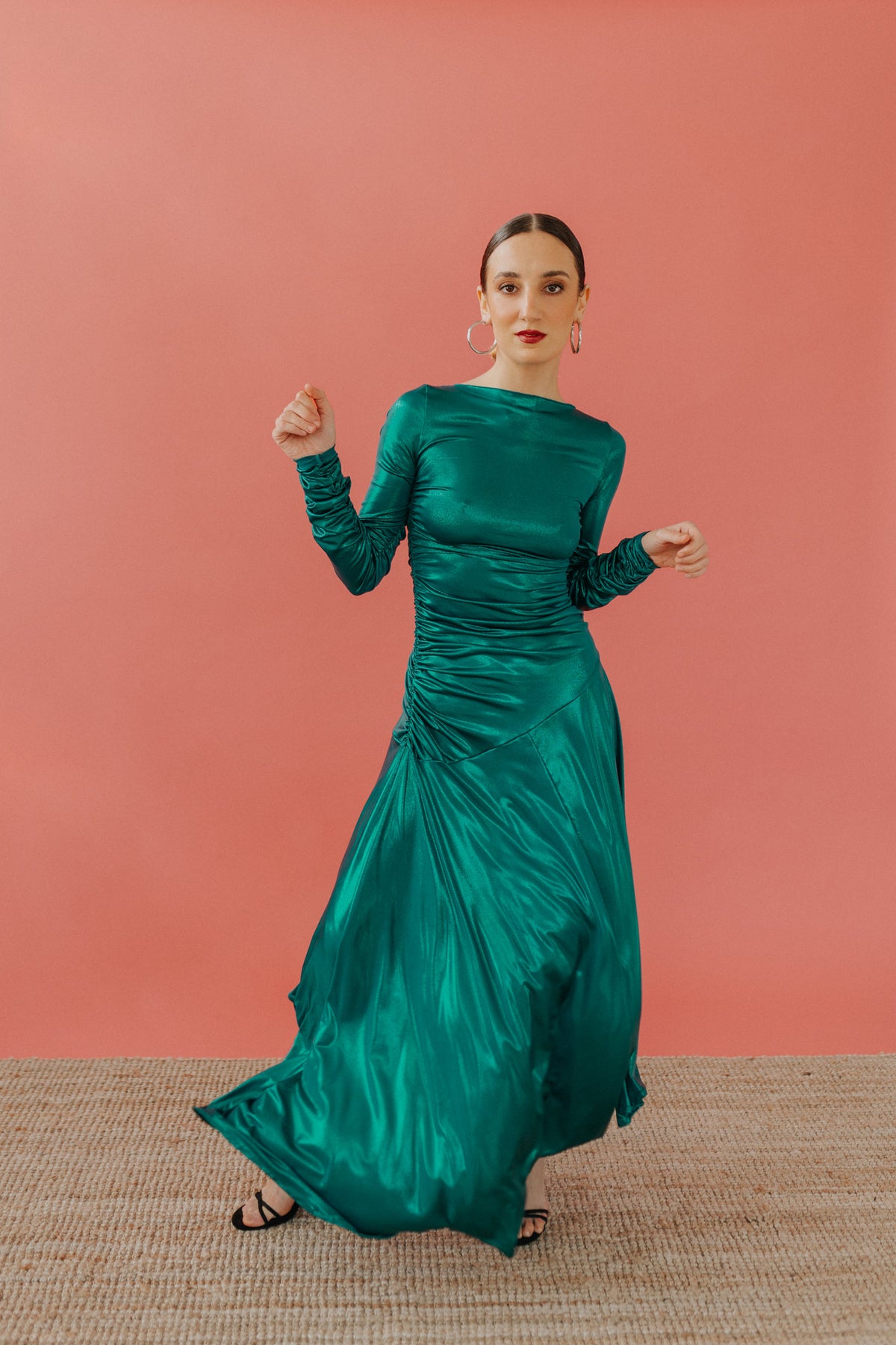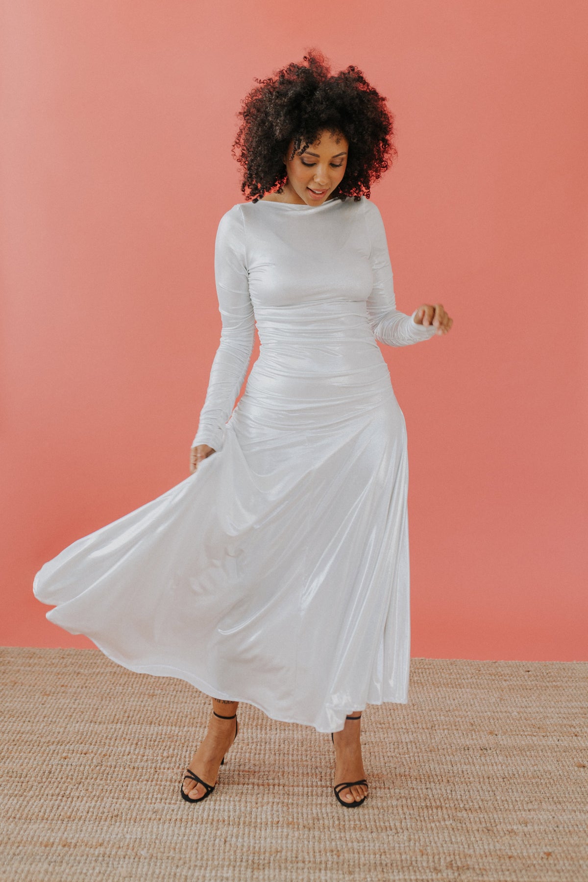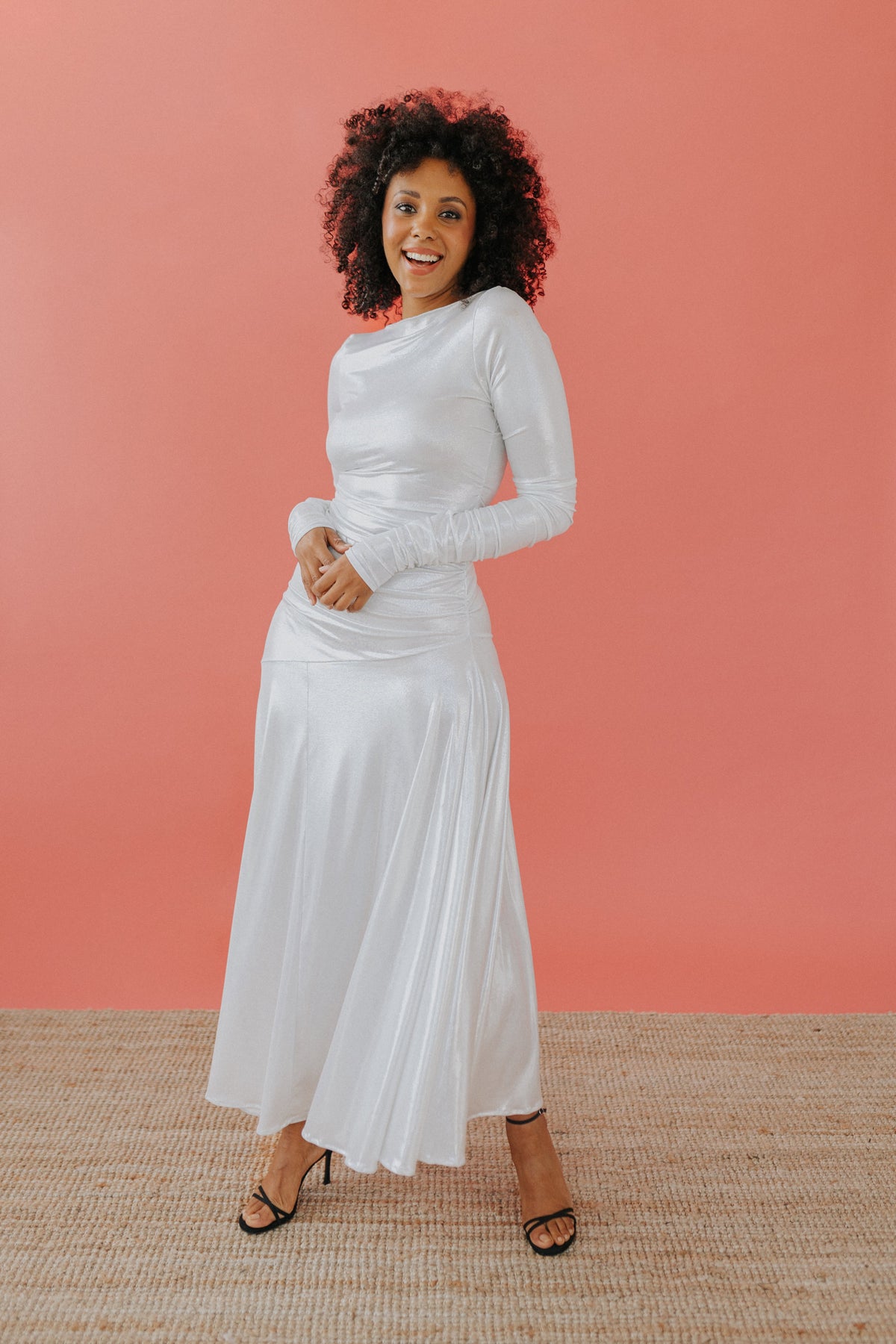 Lo scollo è a barca ed il corpo dell’abito è completamente drappeggiato, la gonna ampia ed asimmetrica.